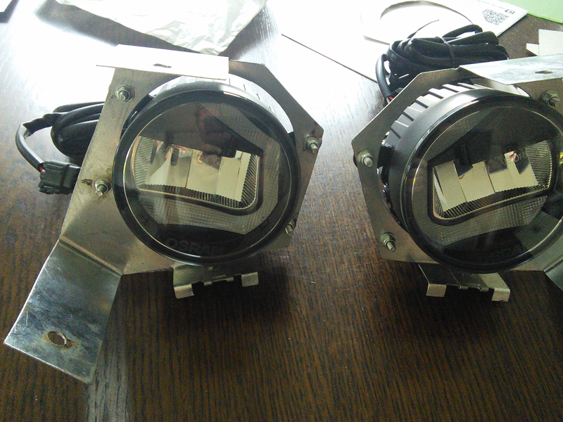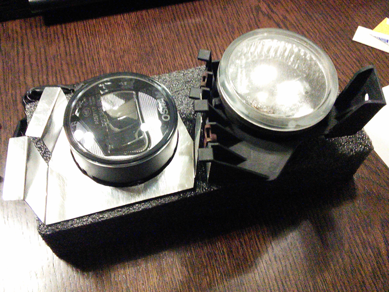 Herbst oder Dämmerung, da wollte ich immer diese neumodischen Tagfahrlichter haben um besser geseh'n zu werden. Also, nachrüsten. Natürlich kann man anstatt mit TFL einfach immer mit Stand- oder Abblendlicht fahren. Der Mehrverbrauch (und die öfter durchbrennenden Birnen) rechnen sich lange gegen die Kosten der TFL. Aber es ist nicht so schick und muss nicht gebastelt werden. Außerdem hatte mein Auto keine Nebelscheinwerfer - die ich auch schon immer haben wollte. Und rein zufällig gibt es genau das als Kombination von Osram. Nachdem die Zubehör-Nebler bei Subaru schon teurer sind als die TFL, rechnet sich das also alles endlich wunderbar. Außerdem paßt es hervorragend in die Aussparungen des Stoßfängers. Wunderbar. Einziges Problem: es lohnt sich für Osram nicht für Subaru alle Aufnahmen und Stecker zu produzieren. Also: selber machen. Erst in Alu, dann in Stahl. Sitzt, passt, wackelt und hat Luft. Die Halterung mußte 'lediglich' in die Aufnahmen der originalen Nebler passen (erstes Bild):